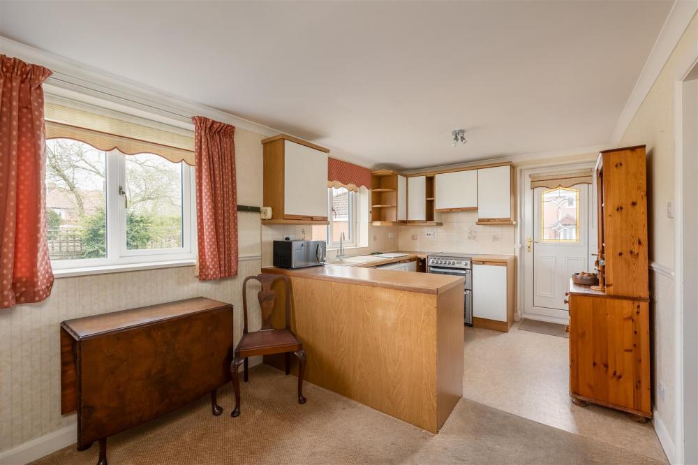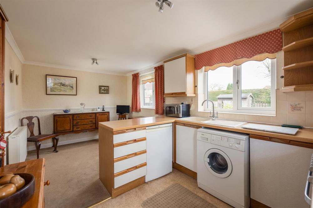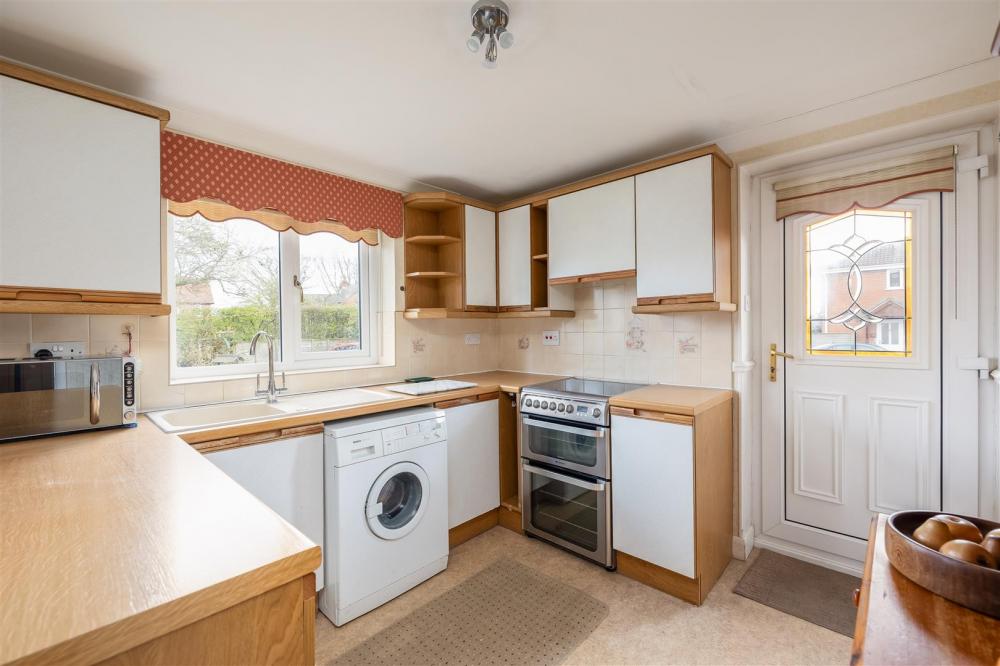 Comprising single drainer sink unit set within rolled edge work surfaces with tiled splash backs, further wall and base units incorporating drawer compartments, plumbing for automatic washing machine, understairs storage cupboard, double glazed window to the rear elevation and door to outside.
