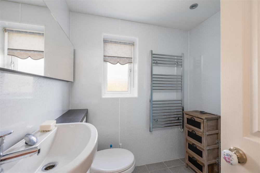 Comprising shower cubicle with shower unit, wash hand basin, low flush w.c., chrome heated towel rail and double glazed window.
